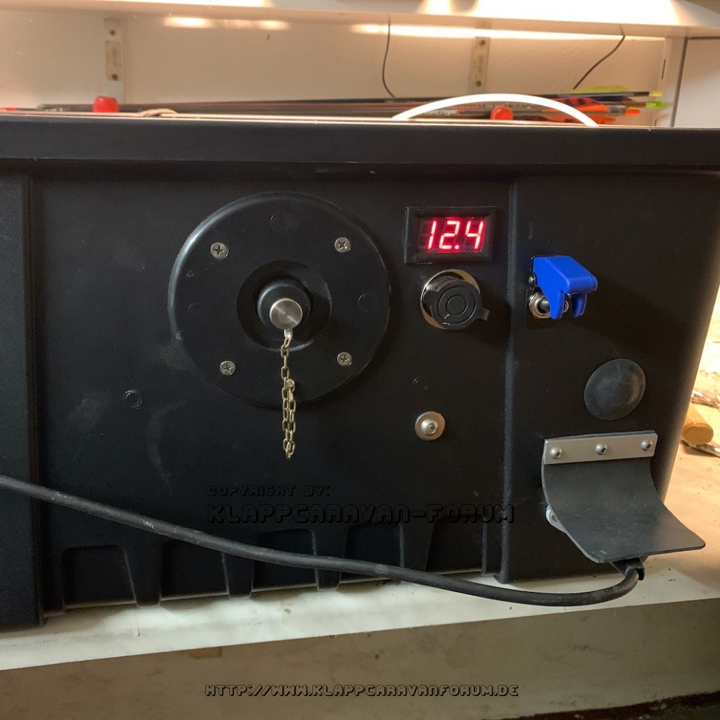 Die Dachzeltheizung. Eingebautes Netzteil für Landstrom. Batterie und Dieseltank im Hänger.