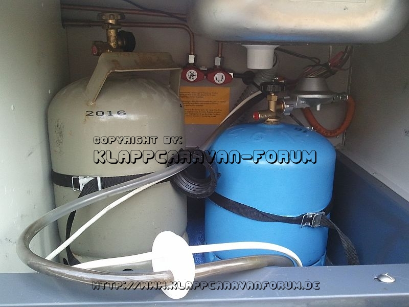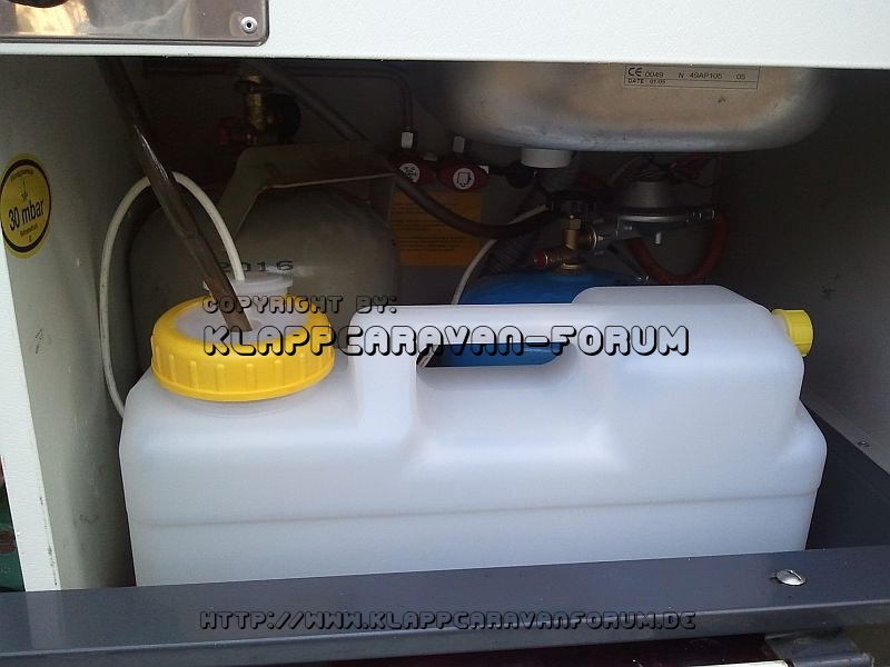 für die Gasversorgung im CC sind ja die R904 von Campingaz vorgesehen. Den Preisen zufolge ist das dort verfüllte Gas vermutlich vergoldet, jedenfalls rollt es mir bei den Tauschpreisen die Zehennägel hoch. Zum Glück hatte ich noch eine graue 3kg-Flasche aus meinem Camptourist und konnte mit Freude feststellen, dass diese an Stelle des Wassertanks unter die Spüle passt! Also habe ich für die Campingaz-Flasche einen DIN-Adapter gekauft und kann nun problemlos zwischen blau und grau wechseln. Leider passt der Original-Wassertank dann nicht mehr mit rein, aber dieser Raumspar-Kanister passt!