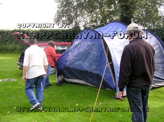 Wiebke und Reinhard beim Zeltaufbau, Rollo schaut zu :)