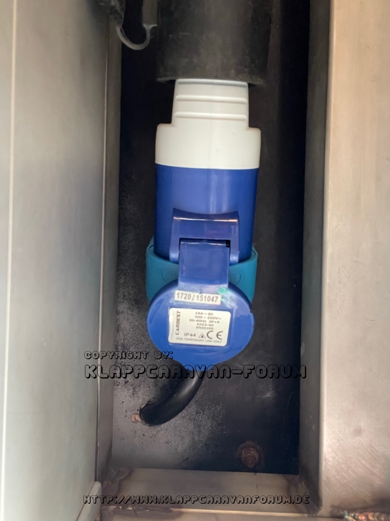 Von außen wird der Strom zentral über die CE-Buchse unterhalb der Zeltplattform eingespeist. Mit Kabelkanälen wird der Strom unterhalb der Matratze zu Doppelsteckdosen am Kopf- und Fußende verteilt sowie im Laderaum zur Versorgung der Campingküche.