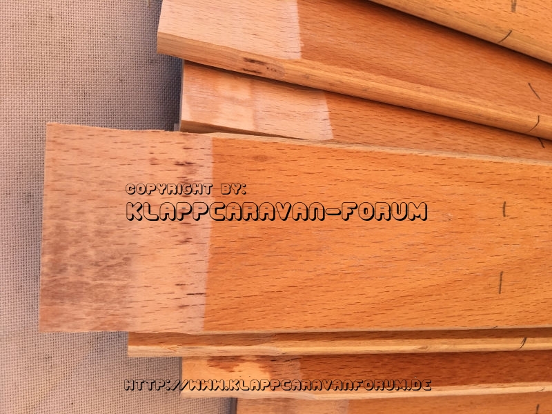 Eine Latte im Bett meines Sohnes ist einer ähnliche Überlastung zum Opfer gefallen und wir hatten mit dem Rost eh schon öfter Probleme. So musste mein Organspender erst einmal woanders aushelfen und ich habe das Bett komplett neu 'belattet'. Aber es blieben 8 Latten übrig. nach kurzer Inspektion am Falter war klar, dass der Bereich des Körperschwerpunktes in der Mitte getauscht werden sollte. Die Latten fühlten sich schon deutlich weicher an, wie die am Rand. Meine Hoffnung, dass die Latten nach dem Zusägen trotz ihrer etwas größeren Abmaße in die Aufnahmen passte wurde zerstört, aber ich hatte auch schon die Latten vom Junior mit dem Elektrohobel passend gemacht -also kam er kurzerhand wieder zum Einsatz und die Enden der Latten wurden zurecht gestutzt: