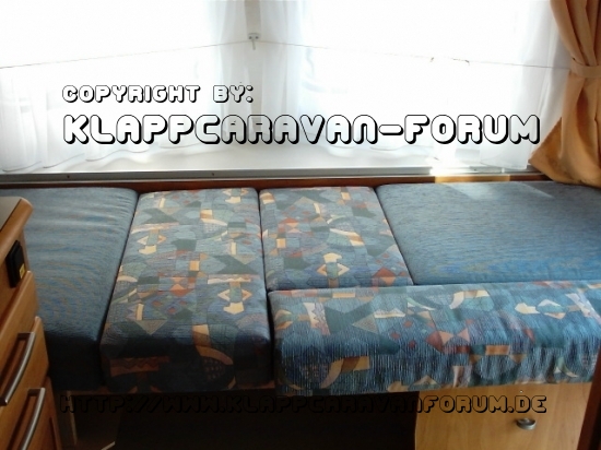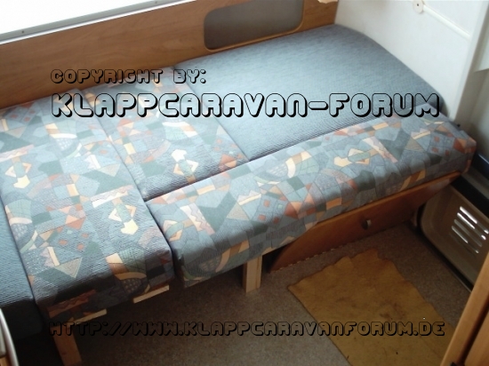 Bild 6: Hier sind alle Polster, bis auf die Bettverbreiterung aufgelegt. Dieses Extra-Polster ist leider etwas zu lang und geringfügig zu breit. In der Länge habe ich den Schaumstoffkern um 3cm gekürzt, weil es immer gegen die Ablagen in der Tür gedrückt hat und die eine Strebe der Türablage bereits gelitten hat. Die rechte Latte des Lattenrostes ist kürzer, damit bei eingeklappter Bettverbreiterung genügend Beinraum zur Verfügung steht – ohne dass man sich blaue Flecken holt.
