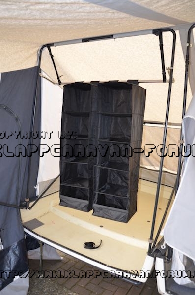 Noch ein Nachtrag. Normalerweise ist ja noch die Kabinenblende angebracht. Wegen der besseren Illustration hatte ich sie weggelassen. Im hochgeklappten Zustand des Bügels "stoßen" die Schränke gegen die Blende. Das stört aber nicht weiter, weil das nur wenige Sekunden zwischen Auffalten des Zeltes und Herunterlassen des Bügels stattfindet.