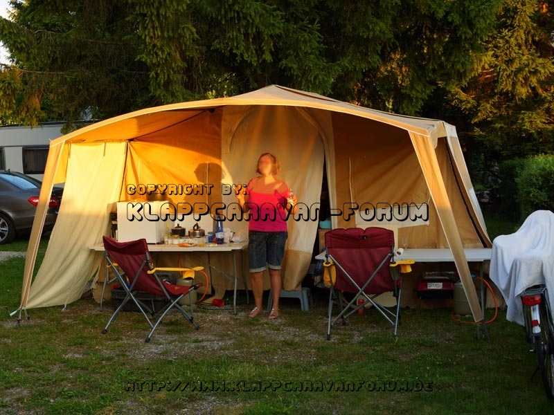 Die stellten wir immer auf, auch bei Kurzübernachtungen. Einen habe ich um 10cm gekürzt, dann passen die Campingstühle besser dazu. Transportiert werden sie aufgeklappt (natürlich ohne die Beine) auf dem Wagen, wenn man nur einen hat, könnte man den auch zwischen Deichselbox und Wagen schieben. Anbei ein Bild